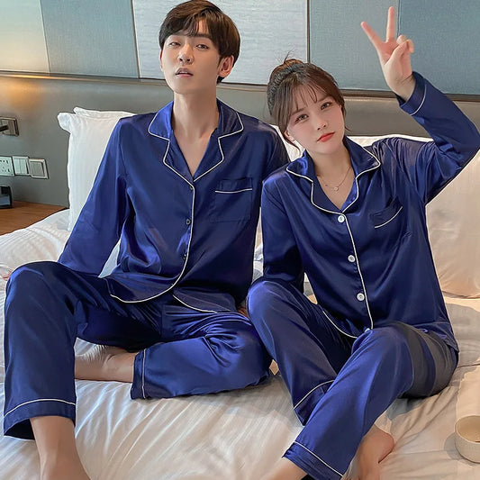 Couple Simulation Silk Pajamas Set of 2 Sets of Men Turned Long-Sleeved Long Pants Spring and Summer Home Wear Ladies Homewear