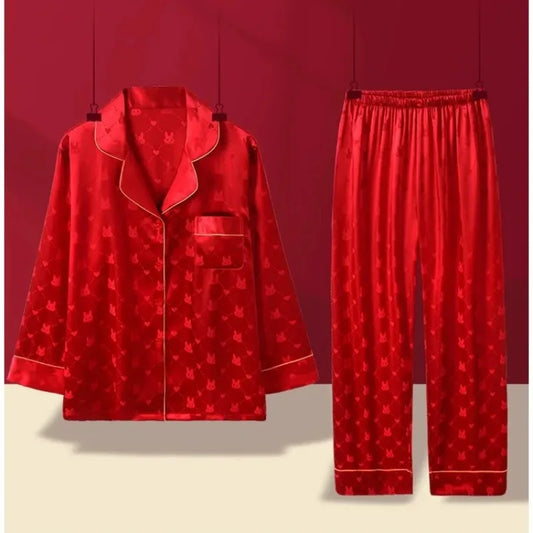 Spring Autumn New Ice Silk Women's Pajamas Lapel Cardigan Sets for Women 2 Pieces Fashion Red Home Suit for Women Soft Sleepwear